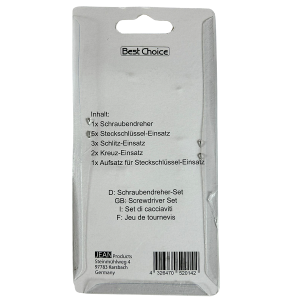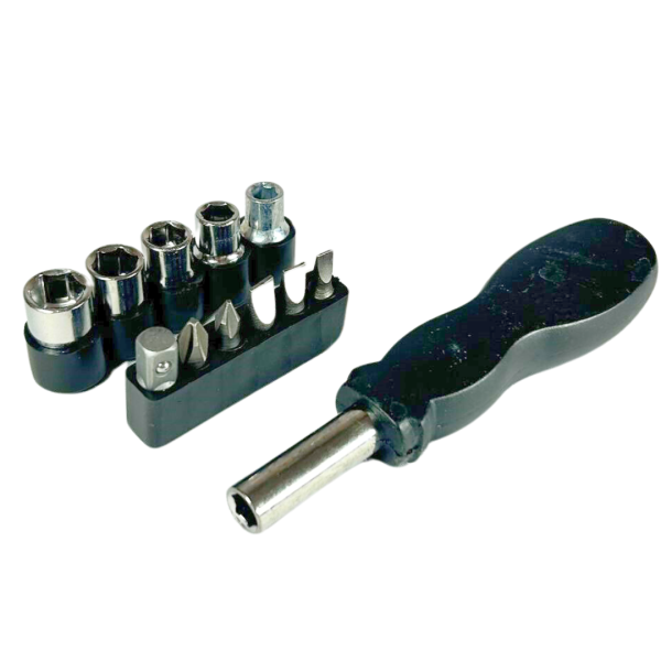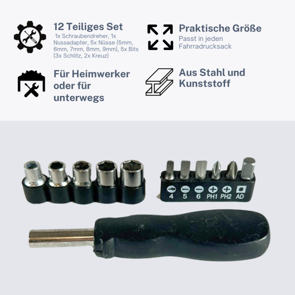 Enthält 1 ergonomischen Schraubendreher, 5 Bits (3× Schlitz, 2× Kreuz) und 5 Nüsse (5 mm, 6 mm, 7 mm, 8 mm, 9 mm)